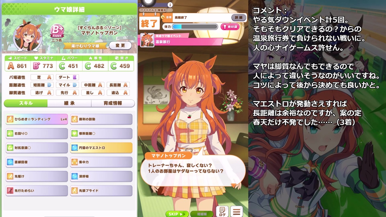 Source: pbs.twimg.com どうも犬ガオです。 前回に引き続き、ウマ娘へのパッションが高まったのでウマ娘記事です。 攻略系youtuberみたいな効率とかそんな話ではないので、それ目的の方は閉じた方がいいです。 今記事の三つの要約 ・ウマ娘の育成が難しいと感じる時は、彼女を理解していない! ステータス+5 体力ー5 秋川理事長の絆+0~5 休むのも大切 体力+5 レース勝利! About press copyright contact us creators advertise developers terms privacy policy & safety how youtube works test new features アプリ『ウマ娘 プリティーダービー』で、5月28日12:00よりストーリーイベント花咲く乙女のjuneprideが開催されます。 アプリ『ウマ娘』新イベントはマヤノトップガンとエアグルーヴの限定ストーリーが読める 文 電撃オンライン アプリ ウマ娘 マヤノトップガン 【育成ウマ娘】マヤノトップガン(サンライト・ブーケ)のパラメータ・スキル 2021年5月30日 スポンサーリンク 目次 1 マヤノトップガンの基本情報 1.1 初期パラメータ.